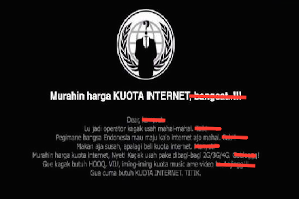 Pegimane bangsa Endonesia mau maju kalo internet aja mahal. Makan aja susah apalagi beli kuota internet. Murhain harga kuota internet. Kagak usah dibagi-bagi 2G/3G/4G,” begitu tulisan yang ditinggalkan peretas dalam laman yang berlatar belakang warna hitam.