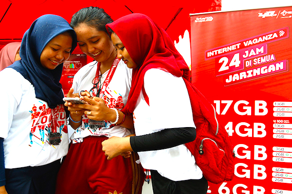 Layanan Data Telkomsel: Tiga remaja pelanggan Telkomsel sedang menggunakan layanan data. Dalam kurun waktu 20 hari pertama di bulan Ramadan 1439 Hijriyah, rata-rata pelanggan Telkomsel mengonsumsi 134 MB layanan data setiap harinya atau meningkat sekitar 23% dibandingkan hari biasa. Penggunaan layanan data didominasi pemakaian media sosial yang meningkat 24% dibandingkan hari biasa.