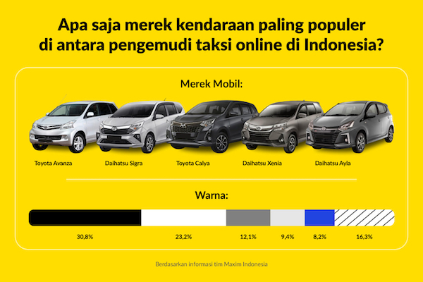 MAJALAH ICT – JAkarta. Selama lebih dari enam tahun beroperasi di Indonesia, layanan taksi online Maxim memiliki beragam cerita dan fakta menarik. Tim Spesialis dari Research Development Maxim Indonesia telah melakukan riset mengenai apa saja warna mobil yang paling banyak digunakan mitra driver Maxim. Selain itu, Maxim juga menemukan fakta menarik lainnya berupa nama, rata-rata usia, hingga merek mobil yang paling banyak digunakan mitra driver taksi online Maxim.